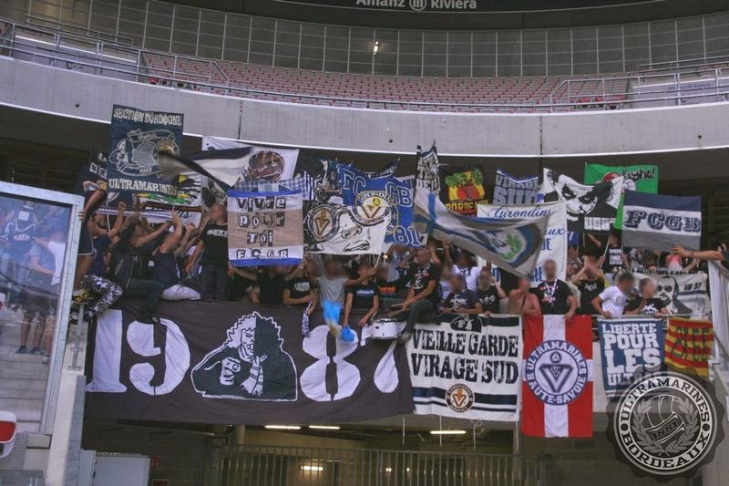 Wenns läuft, dann läufts. Dieses Sprichwort trifft in Bordeaux momentan definitiv zu. Nachdem man zu Beginn der Saison mit Montpellier und Monaco zwei Mannschaften besiegte, die definitiv keine Laufkundschaft sind, gab es auch am vergangenen Wochenende einen Auswärtssieg in Nizza. Im Gästeblock fanden sich ca. 300 Bordelais ein, die zu Spielbeginn ein Doppelhalter- und Fahnenintro, garniert mit etwas Pyro präsentierten. Zunächst musste man einen Rückstand durch Bosetti hinnehmen. Jener Bosetti stand früher schon in der Kurve in Nizza und hat nach wie vor gute Kontakte zur Ultraszene in Nizza. Entsprechend feierte Bosetti provozierend direkt vor dem Gästeblock, was natürlich alle Mitgereisten toben ließ. Im Anschluss konnte Diabate relativ schnell per Elfmeter ausgleichen und mit einem Doppelschlag nach Wiederanpfiff konnte der FCGB die Vorentscheidung erzielen. Der Gästeblock natürlich jetzt in Feierlaune: 3 Siege aus 3 Spielen, das gelang nicht einmal in der Meistersaison 2008/2009. Am kommenden Sonntag trifft der FCGB jetzt im heimischen Stade Jaques-Chaban-Delmas auf den SC Bastia, der mit 4 Punkten aus 3 Spielen mäßig gestartet ist. Wir hoffen auf weitere 3 Punkte für Willy Sagnol und Co! Allez Marinebleu!
