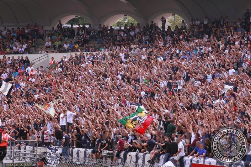 Seit unserem letzten Bericht aus Bordeaux sind 4 weitere Spiele absolviert worden. Die Bilanz fällt weiterhin sehr positiv aus. Gab es in Guingamp noch eine 1:2 Niederlage, konnte man im Anschluss Tabellenschlusslicht Evian mit 2:1 besiegen. Unter der Woche ging es dann zum Spitzenspiel nach St. Etienne. Beide Lager verbindet eine jahrzehntelange Freundschaft und so wurde, wie üblich, vor dem Spiel in einem gemeinsamen Corteo zum Stadion gezogen und man ließ ein paar Lieder auf die Freundschaft erklingen. Allerdings fanden sich aufgrund des ungünstigen Termins (Donnerstag Abend) lediglich knapp 100 Gäste im Gästeblock ein, die am Ende jedoch immerhin ein etwas glückliches 1:1 bejubeln durften. Im Heimspiel vergangenes Wochenende gegen Rennes sicherte Mittelfeldmann Toure dem FCGB in der zweiten Minute der Nachspielzeit schließlich den nächsten Dreier, indem er zum entscheidenden 2:1 traf. Der Jubel auf der Virage Sud kannte natürlich keine Grenzen mehr. Somit ist man nach 8 Spielen mit 17 Punkten Tabellenzweiter, mit 2 Punkten Rückstand auf Tabellenführer Marseille. Nun geht es dieses Wochenende zum Vorletzten aus Reims. Anschließend steht ein Heimspiel gegen Caen auf dem Programm, ehe die heißen Wochen beginnen und es u.a. gegen Paris,Toulouse, Nantes, Lyon und Metz geht. Wir freuen uns schon mit den Bordelais darauf und hoffen, unsere Freunde bei dem ein oder anderen Spiel unterstützen zu können. Syndrome de Toure! Allez Bordeaux!