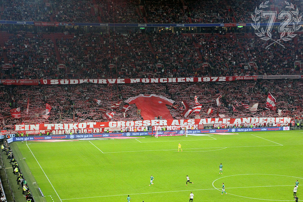Im Stadion gab’s heute gleich zwei Aktionen: Zum einen wurde unsere Freundschaft zur Horda Azzuro, die nun seit 15 Jahren besteht, mit einer Choreo im Unterrang nochmals zelebriert. Zudem hatten wir auch heute nochmal die Blockfahne im Stil eines rot-weißen Trikots im Gepäck. Auch die Fanclubs zeigten ihren Unmut über die aktuelle Trikotsituation, indem sie kleine Überhänger in Form der Blockfahne über ihren Zaunfahnen anbrachten. Aufgrund des Wiesn-Heimspiels brachte unser Verein natürlich wieder ein Sondertrikot auf den Markt – und ganz ehrlich, mir ist es mittlerweile auch egal, was sie da ausprobieren. Aber dass man ausgerechnet gegen Werder Bremen in einem hellen Grün aufläuft, finde ich dann schon etwas verrückt. Aber nun genug zur Trikotthematik und zurück zum Spiel.