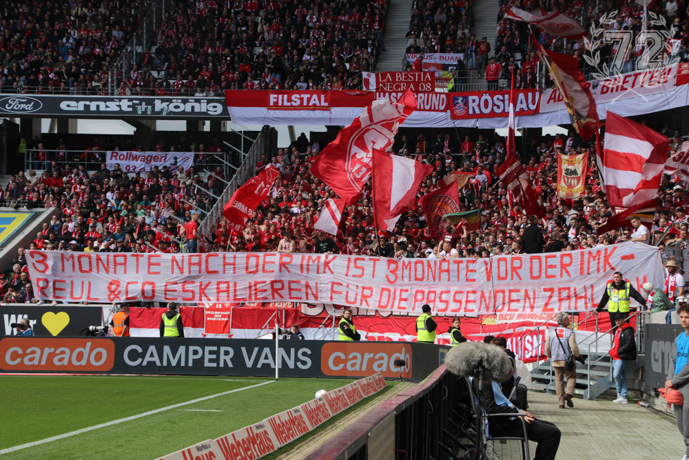 Abseits des Platzes für uns Fans relevant: Das Thema Sicherheit beim Fußball scheint bei manchen Innenpolitikern immer noch ganz oben auf der Agenda zu stehen. Dazu zeigten wir im Rahmen des Aktionsspieltag der Fanszenen und passend zum in der Vorwoche erschienen Halbzeitstatement der Fankurven Deutschlands das Spruchband: 3 Monate nach der IMK ist 3 Monate vor der IMK: Reul und Co eskalieren für die Zahlen. Es ist ja mehr als auffällig, wie sehr Zwischenfälle im und am Stadion seit Jahresbeginn zugenommen haben. Das Muster gleicht sich dabei überall: Polizeieinheiten gehen mit übertriebener Härte und mangelnder Verhältnismäßigkeit gegen Fans vor, teils anlasslos, teils aufgrund von kleineren Verstößen, die massiv eskaliert werden. Bei der Häufigkeit kann man schwerlich noch Einzelfälle annehmen, sondern muss von einem politischen Willen einiger Hardliner bzw. einer aus politischen Ämtern heraus gesteuerten Kampagne ausgehen. Wo es im Winter mit purem Populismus nicht funktioniert hat, versucht man es jetzt wohl mit Sachargumenten, indem man die Verletzten- und Festnahmezahlen zu steigern versucht oder auch, indem mit Schlagzeilen und Bildern entsprechende Emotionen in der Bevölkerung konstruiert werden sollen. Hardliner-Innenminister wie Reul (NRW), Schuster (Sachsen) und Behrens (Niedersachsen) scheinen dabei eine Avantgarde zu bilden, die in den Kampf gegen Fanfreiheiten führt. Schon die Tatsache, dass die Vereine der DFL die neue, deutlich verschärfte Version der Stadionverbotsrichtlinie mit Fanvertretern an allen Standorten besprechen wollten und die Verabschiedung daher verschoben werden musste, hat ausgereicht, dass Reul und Schuster im Kicker-Interview direkt wieder mit Drohgebärden in Form von personalisierten Eintrittskarten und Gesichtserkennung um sich werfen. Und auch von noch wesentlich tiefgreifenderen Maßnahmen haben Innenbehörden gegenüber Vereinsvertretern schon fabuliert. Das Thema wird mindestens bis in den Juni hinein akut bleiben. Gut, dass wir fast bis dahin ohnehin voll im Saft stehen werden. Wir fahren nach Berlin, wir fahren nach Budapest! Mit dieser Mannschaft ist wieder alles möglich!